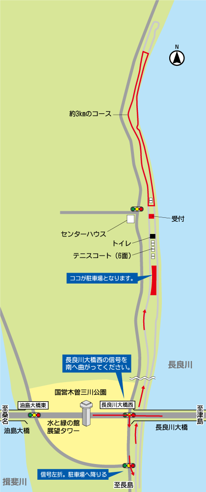 ※堤防道路を横断する必要がある場合、交通量が多いため十分注意してください。